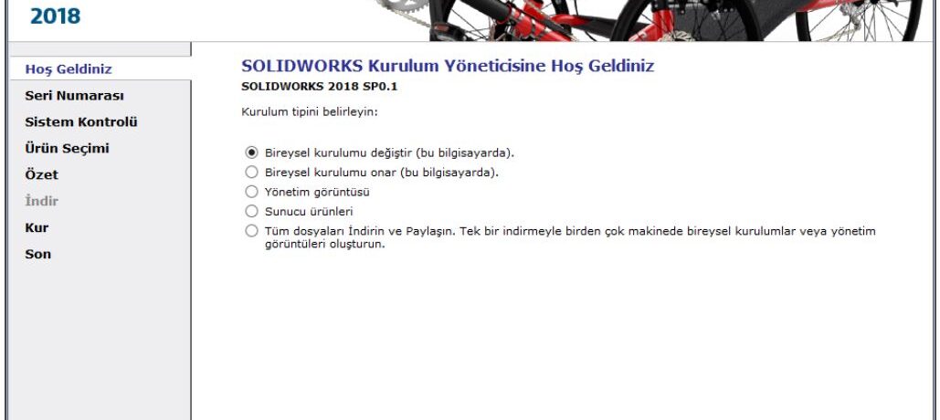 1. SOLIDWORKS Kurulum Adımları Öncelikle kuruluma başlamadan önce, eğer var ise Antivirüs yazılımını duraklatınız veya kapatınız. SOLIDWORKS 2018 kurulum CD‘ sini bilgisayara takınız. Kurulum Yöneticisi otomatik olarak açılacaktır. Kurulum yöneticisi otomatik olarak başlamadığı durumlarda DVD içerisindeki “setup.exe” dosyasını çalıştırabilirsiniz. Kurulum Tipi olarak “Bireysel (Bu Bilgisayarda)” seçerek “İleri” butonuna tıklayınız (Resim 1).